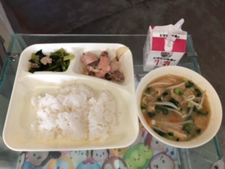 今日の献立は、鶏肉のゆず塩焼き、みそ汁、こまつなの煮びたし、ごはん、牛乳です。