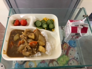今日の献立は、チキンレバーカレーライス、きゅうりとコーンのサラダ、いちご、牛乳です。