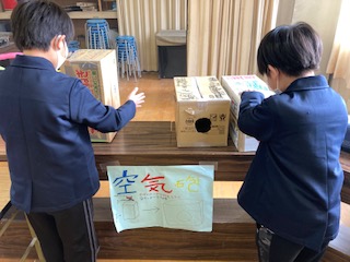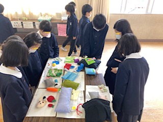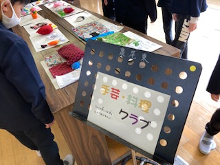 科学工作クラブは、どろだんごや空気砲など、楽しい作品を展示しています。手芸料理クラブは、1年間かけて製作したマスコットや小物入れなどをきれいに飾っていました。