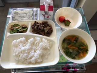 今日の献立は、手巻きご飯(牛肉の甘辛煮、ツナソテー)、すまし汁、いちご、牛乳です。