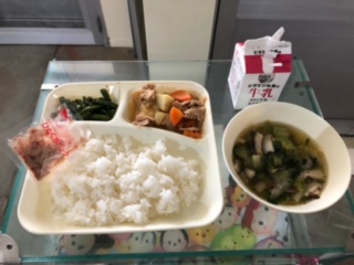 今日の献立は、変わり肉じゃが、鶏肉と白菜のすまし汁、さんどまめのごまあえ、ごはん、牛乳です。