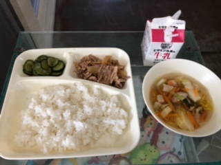 今日の献立は、豚肉のコチュジャンいため、鶏肉とはるさめのスープ、きゅうりのナムル風、ごはん、牛乳です。