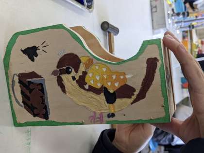 思い思いのデザインに色をつけ、目立たせたいところは彫刻刀で彫りを入れて、ニスを塗っていきます。