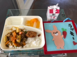 今日の献立は、カツカレーライス、フルーツゼリー、牛乳です。
