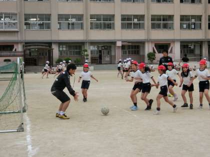 セレッソ大阪の選手をお招きし、4年生にサッカーの授業をしていただきました。サッカーボールを扱う基本練習やミニゲームなど、楽しく教えていただき、サッカーの魅力をたっぷり味わうことができました。選手2人と子どもたちとの対戦ゲームでは、子どもたちは全力でサッカー選手に挑戦していました。