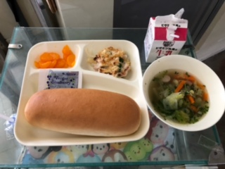今日の献立は、マカロニグラタン、レタスのスープ、コッペパン、ブルーベリージャム、みかん(かんづめ)、牛乳です。