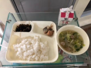 今日の献立は、さけのごまみそ焼き、五目汁、ひじきのいため煮、ごはん、牛乳です。