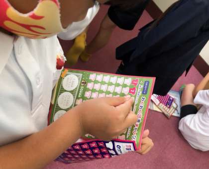 雨で運動場が使えないこともあり、今日の図書館開放は大盛況。大阪市立図書館からいただいた読書手帳に、早速シールを貼っている様子も見られました。