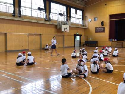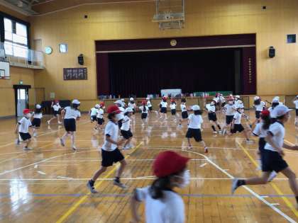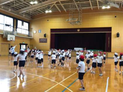 1年生と2年生は、来週一緒に遠足に行く予定です。グループに分かれて活動しますので、それまでにいっぱい仲良くなっておこうと、講堂で遊びました。