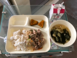 今日の献立は、豚丼、湯葉のすまし汁、かぼちゃのしょうゆ焼き、牛乳です。