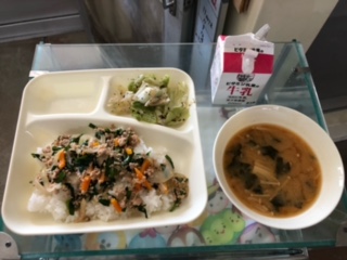 今日の献立は、豚ひき肉とにらのそぼろ丼、みそ汁、キャベツの赤じそあえ、牛乳です。