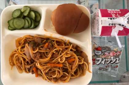 今日の献立は、スパゲッティミートソース、きゅうりのピクルス、アーモンドフィッシュ、黒糖パン2分の1、牛乳 です。