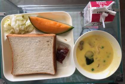 今日の献立は、かぼちゃのクリームシチュー、キャベツのゆずドレッシング、クインシーメロン、食パン、いちごジャム、牛乳 です。