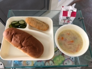 今日の献立は、サーモンフライ、豆乳スープ、きゅうりのバジル風味サラダ、こくとうパン、牛乳です。