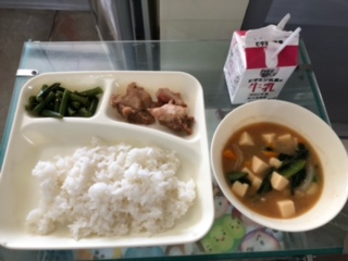 鶏肉のしょうゆバター焼き、とうふのみそ汁、さんどまめのごまあえ、ごはん、牛乳。