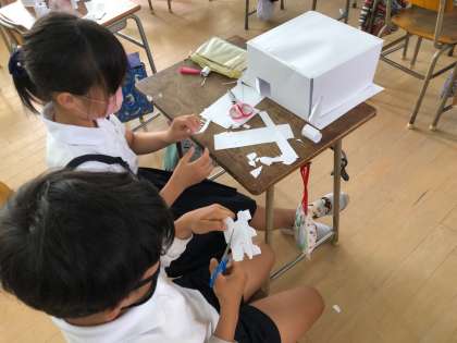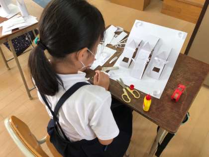 立体のお城をつくっています。より素敵な作品になるように、アイデアを出し合っているようです。