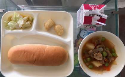 今日の献立は、いかてんぷら、フレッシュトマトのスープ煮、サワーソテー、コッペパン、アプリコットジャム、牛乳 です。
