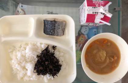 今日の献立は、サゴシの塩焼き、みそ汁、牛ひじきそぼろ、ごはん、牛乳 です。