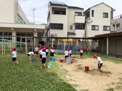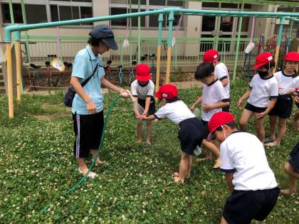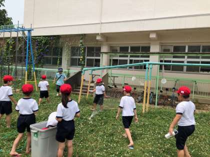 1年生が生活科で水あそびをしました。砂場での泥んこ遊びや、マヨネーズの空容器を水鉄砲にした的あてなど、夢中になって楽しんでいました。