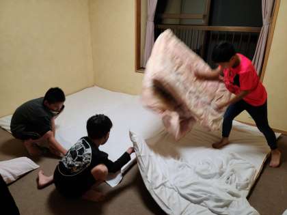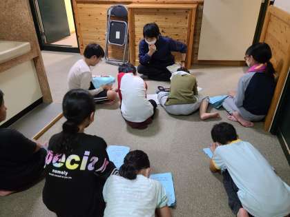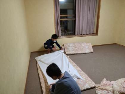 入浴後、活動班の班長会議で今日の活動の振り返りをしました。各部屋の室長は、布団のシーツの付け方を教えてもらいみんなに伝えてました。寝る準備してます。