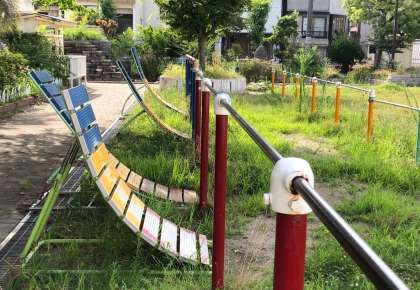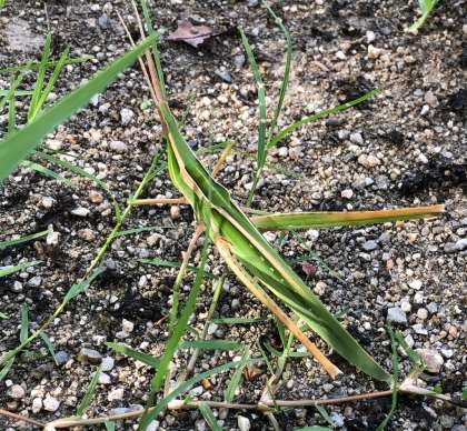 夏休みも半分以上が過ぎました。子どもたちが活動しない間に、鉄棒が草で覆い尽くされています。現在草抜きの途中です。大きなバッタも暮らしています。