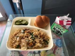 今日の献立は、オイスターソース焼きそば、きゅうりのピリ辛あえ、ソフト黒豆、1/2こくとうパン、牛乳です。