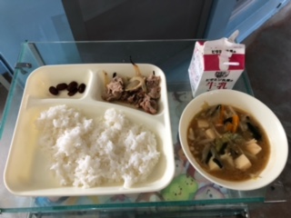 今日の献立は、豚肉の甘辛焼き、みそ汁、金時豆の煮もの、ごはん、牛乳です。