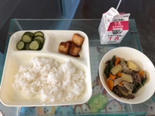 今日の献立は、肉じゃが、あつあげのみそだれかけ、きゅうりのゆずの香あえ、ごはん、牛乳です。