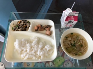 今日の献立は、さけのつけ焼き、五目汁、高野どうふのいり煮、ごはん、牛乳です。