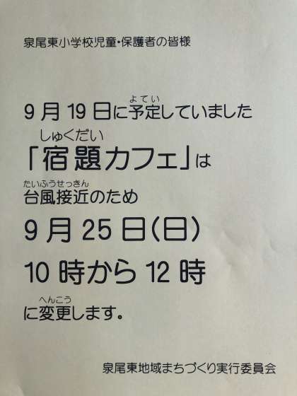 9月19日に予定されていた泉尾東福祉会館での宿題カフェは、台風接近のため、25日に延期されました。