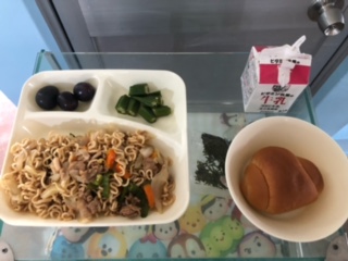 今日の献立は、焼きそば、オクラの甘酢あえ、ぶどう(巨峰)、1/2こくとうパン、牛乳です。