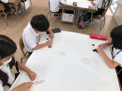 1年生の生活科の時間です。大切に育てたアサガオからとった種の数を数えています。