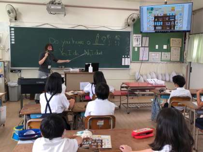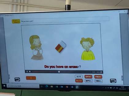 4年生の外国語活動の時間です。身の周りのいろいろな文房具。持っていますか?はい持っています。いいえ持っていません。