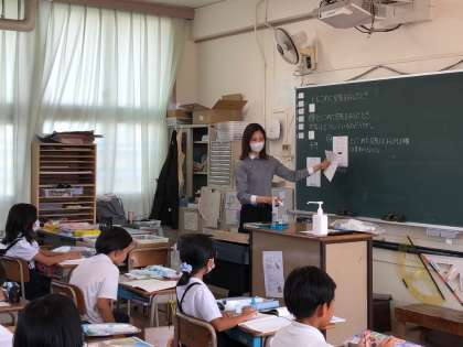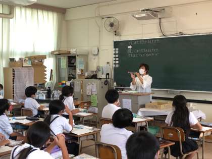 4年生は理科です。閉じ込められた空気を押すとどうなるのでしょう?予想を立てて考えていきました。