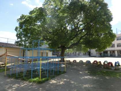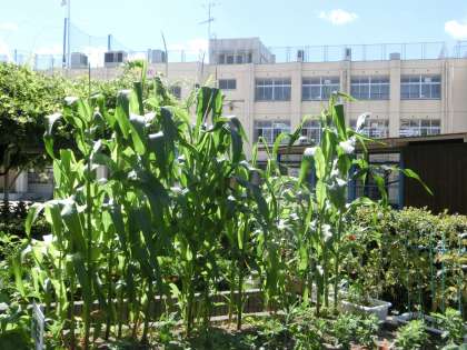 学習園では、トウモロコシが力強く背を伸ばし、天へ向けてその手をいっぱいに広げているかのようです。厳しい夏の日差しではありますが、泉尾東小学校の運動場には、優しい木陰があちらこちらにあります。その代表的なポイントが、クスノキの木陰と藤棚の木陰です。自然の恵みに子どもたちは見守られ、夏の日もすくすくと学校生活を送っています。