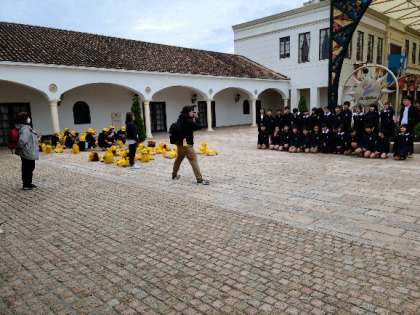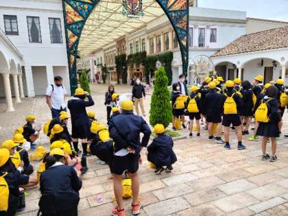 入り口のオブジェの前で集合写真とってます。みんないい顔してます!