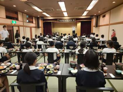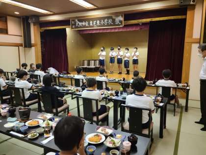 食事係のあいさつでいただきます!いっぱい活動してお腹も空いています。おかわりをしていっぱい食べましょう!