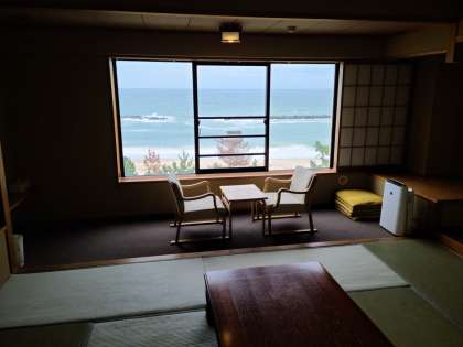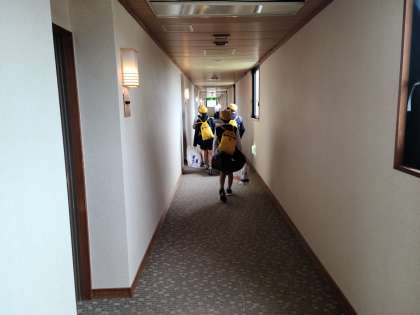 お部屋の片付けをして、先生チェックしてもらい、ロビーに集まりました。忘れ物がないように。次は閉舎式です。