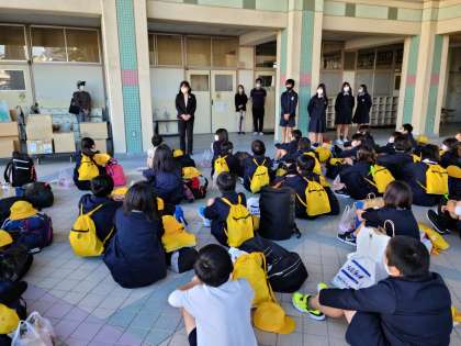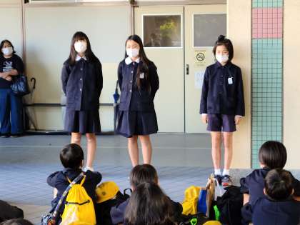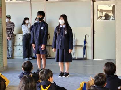 帰校式です。予定より早くなりましたが、お出迎えいただきありがとうございます。全員無事に帰ってくることができました。昨日よりもいろいろ経験し、成長したお子様の話をきいてあげてください!