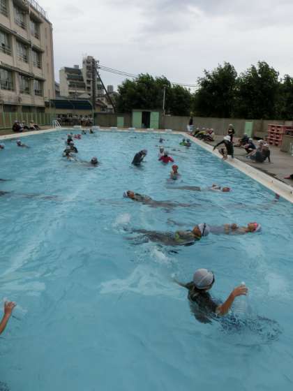 7月16日(木)の5・6時間目、6年生が着衣泳を行いました。服を身に付けて水に入ると、予想以上に重く感じ、動きにくくなることを体験的に実感しました。そして、救難救助体験として、空のペットボトルが貴重な救難具になることを実際に試してみることで、知ることができました。