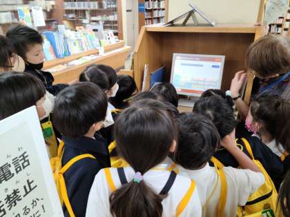 大正図書館に着きました。まずは図書館の方からお話。紙芝居で図書館について説明してくださいました。その後、質問タイムでいろいろ教えてもらいました。いよいよ図書館の中を見学!