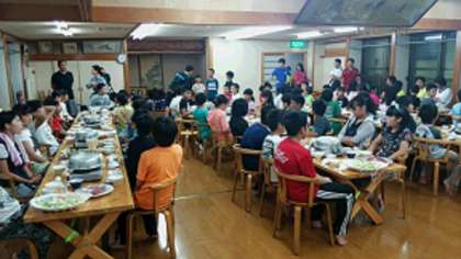 夕食です。宿舎の方からすき焼きの作り方と食事の終わった後の片付け方を教えてもらいました。さあ、いよいよいただきます。しっかり食べて、今日の疲れを回復させましょう!