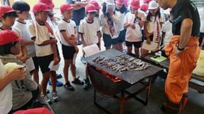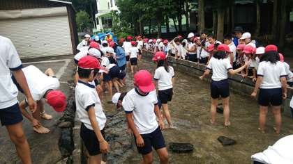 午前の活動、魚つかみです。すばやく動き回る魚を手づかみ。男子よりも女子の方に魚つかみが得意な子どもが多いのが意外でした。