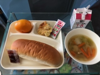 今日の献立は、ツナポテトオムレツ、鶏肉とキャベツのスープ、みかん、コッペパン、いちごジャム、牛乳です。