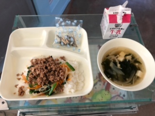 今日の献立は、ビビンバ、わかめスープ、アーモンドフィッシュ、牛乳です。