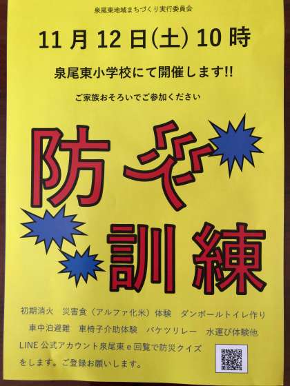 11月12日(土)、本校にて泉尾東地域の防災訓練が実施されます。さまざまな体験やクイズを通して、ご家族で防災について考える絶好の機会となることと思います。