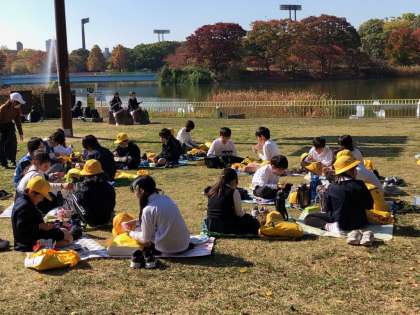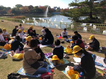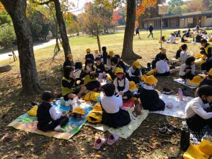 班ごとにお弁当を食べています。たくさん歩いてお腹はぺこぺこ。みんな幸せそのものの笑顔でいただいています。
