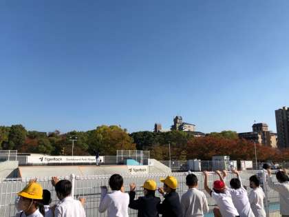 スケボーパークのかっこいい滑りを夢中で見ている子もいます。