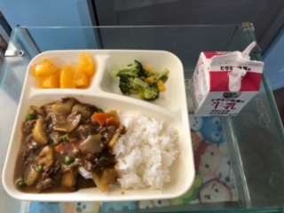 今日の献立は、冬野菜のカレーライス、ブロッコリーとコーンのサラダ、黄桃(缶詰)、牛乳です。