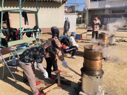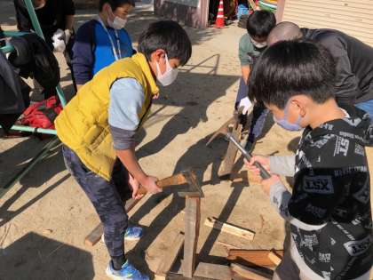 なんと、餅米を蒸すための薪割りも、薪をかまどにくべる体験も、させていただきました。